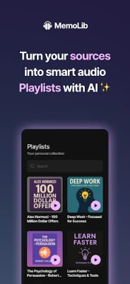MemoLib turns your documents, voice notes, and links into personal audio playlists — powered by AI.