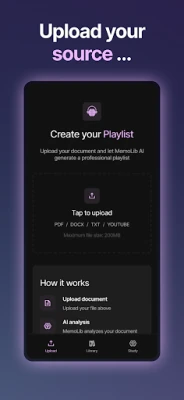 Just upload a PDF, YouTube link, or voice recording, and MemoLib automatically creates a spoken summary with quizzes, flashcards, and an intelligent chat to help you truly understand and retain the content.