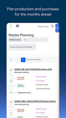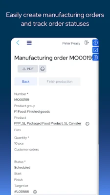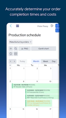You can: * add, view and edit any data. It will be synchronized with MRPeasy platform immediately thus becoming available to all your colleagues; * dynamically re-schedule production orders by dragging them to a different place on the calendar with your finger; * get all available statistics.