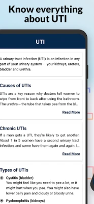 This app provides information about UTI disease, symptoms, treatment, home remedies and much more. The most important functionality of the app is that is provide information about near by users who are affected with UTI, it provides information on map, distance and chat feature. Data is collected from various research reports.