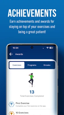 On the 'Awards' tab, you can track these items. Prefer a language other than English? Go to the 'More' tab and select 'Languages' to pick another language option. If you need to book an appointment, please go to the 'Appointments' tab for more info. Make sure to select 'Mark as Complete' when doing your exercises to ensure that your provider can keep track of your progress!